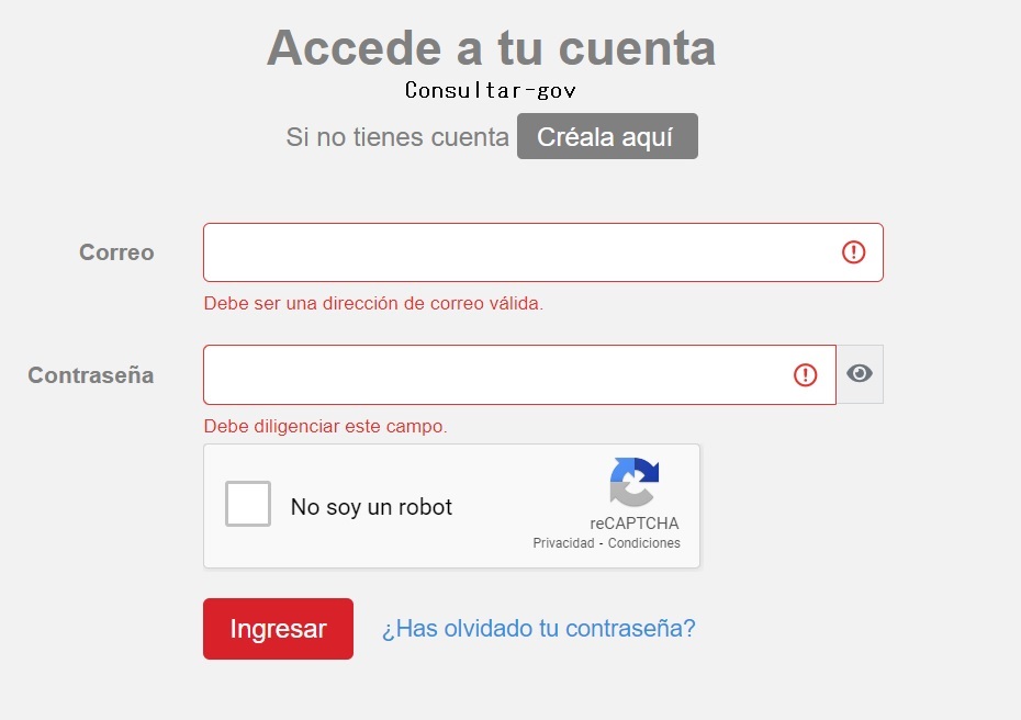 - Estando en la sección de inicio, deberás digitar los datos con los que te registraste, correo y contraseña, luego debes hacer clic sobre No soy un robot y por último en Ingresar.