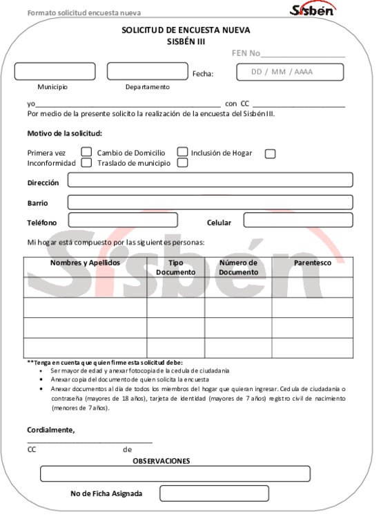 Este es el formato que tendrá que diligenciar en la oficina para poder obtener la nueva visita, recuerde tener toda la información del hogar, por eso es recomendable que el jefe del hogar sea el que realice este trámite, por último, tendrá que esperar la visita nueva del encuestador.