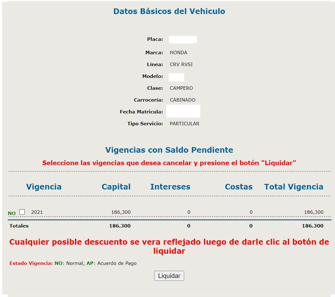- Verifique los datos de su vehículo y haga clic en liquidar.